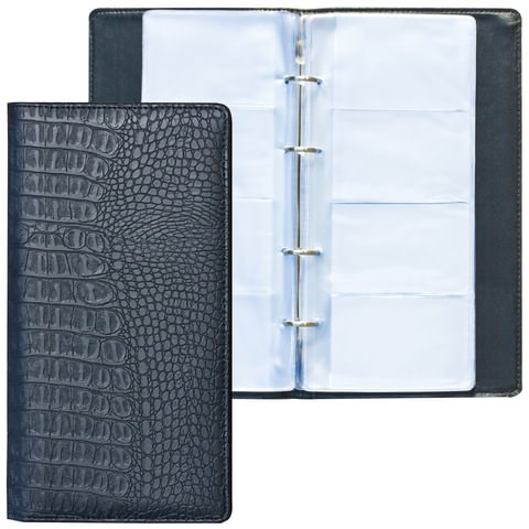 Визитница на кольцах BRAUBERG "Cayman", на 240 визиток, под кожу крокодила, черная, 231763