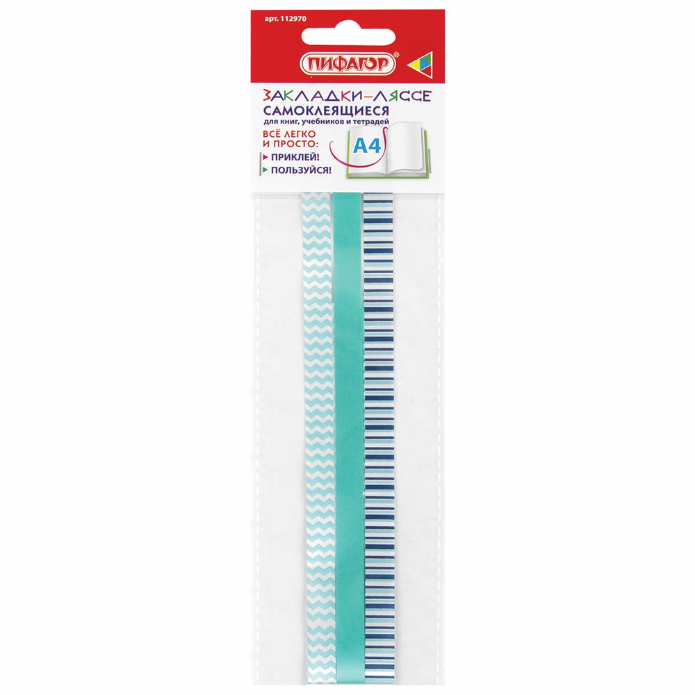 Закладки-ляссе фактурные для книг А4 (длина 38 см) "ЛАЗУРЬ", клейкий край, 3 ленты, ПИФАГОР, 112970