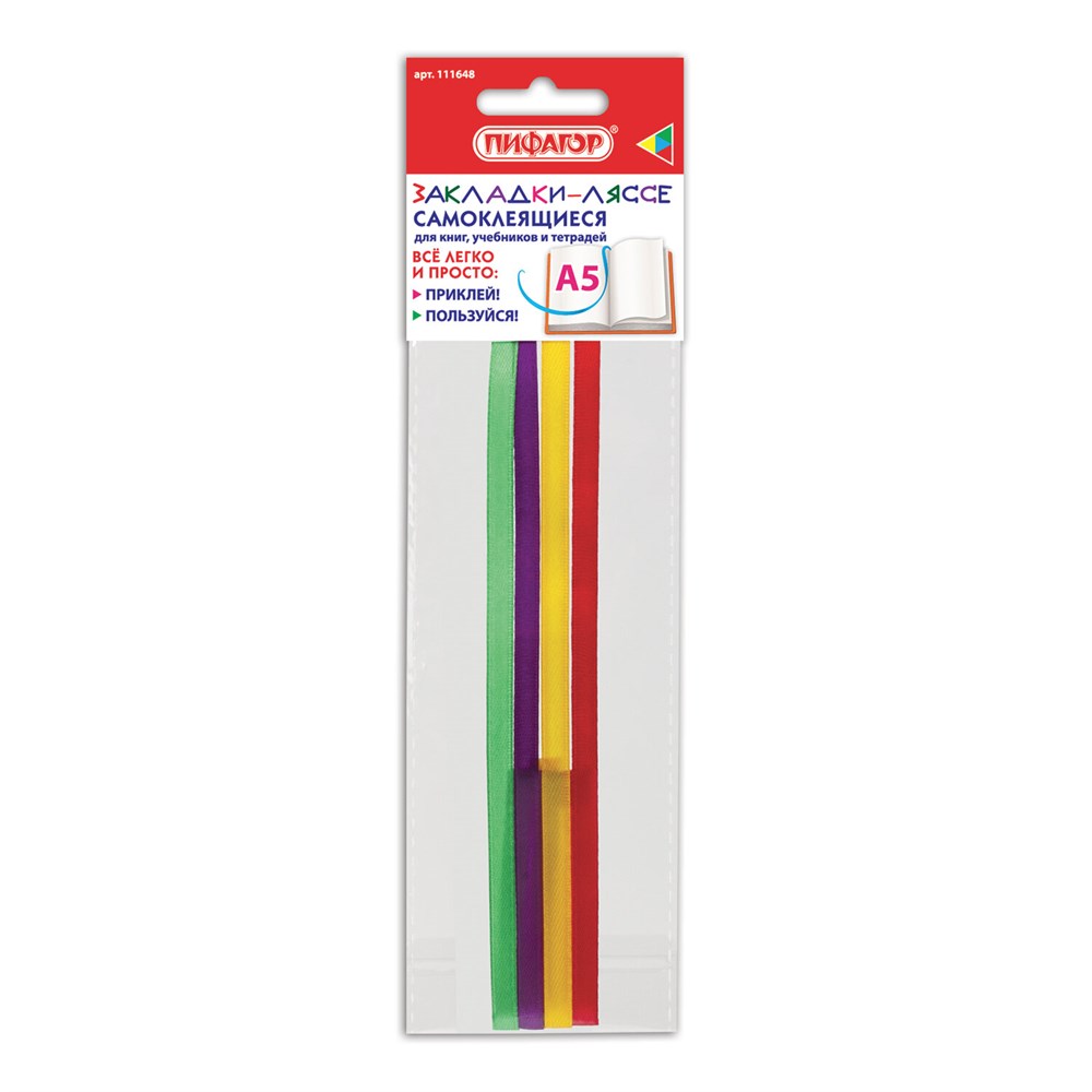 Закладки-ляссе "РАДУГА" для книг А5 (длина 28 см) ПИФАГОР, клейкий край, 4 ленты, 111648
