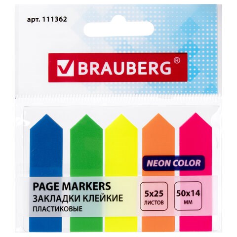 Закладки самоклеющиеся 50х14 мм, BRAUBERG НЕОНОВЫЕ "СТРЕЛКИ", 5 цветов х 25 листов, 111362